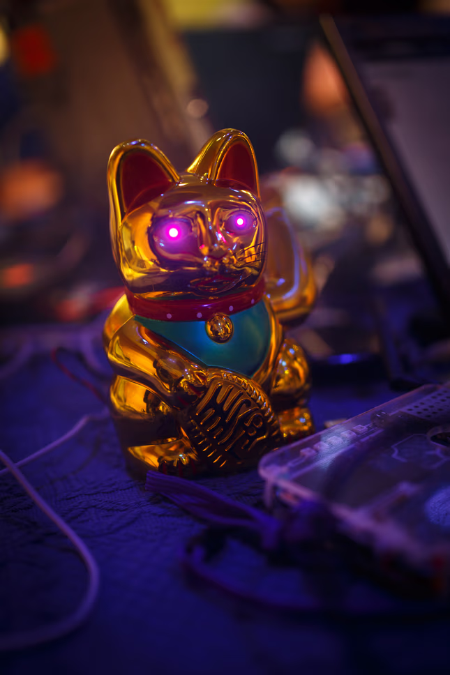 The cyber cat consists of an ESP8266 chip with a servo motor and two WS8212 LEDs. We mounted the arm directly onto the motor.